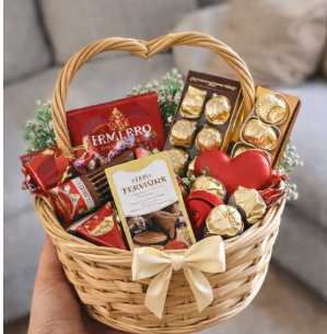 Cesta Mini Romântica com Caneca, Chocolates e Buquê